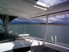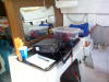 The Yaesu FT-897 is sitting on the galley table. The AGM radio battery is in the compartment below.
