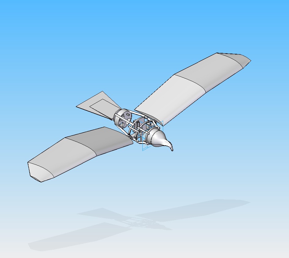 The wings are cut from foam and stiffened with square carbon fiber tubes. The body is constructed using 3D printing.